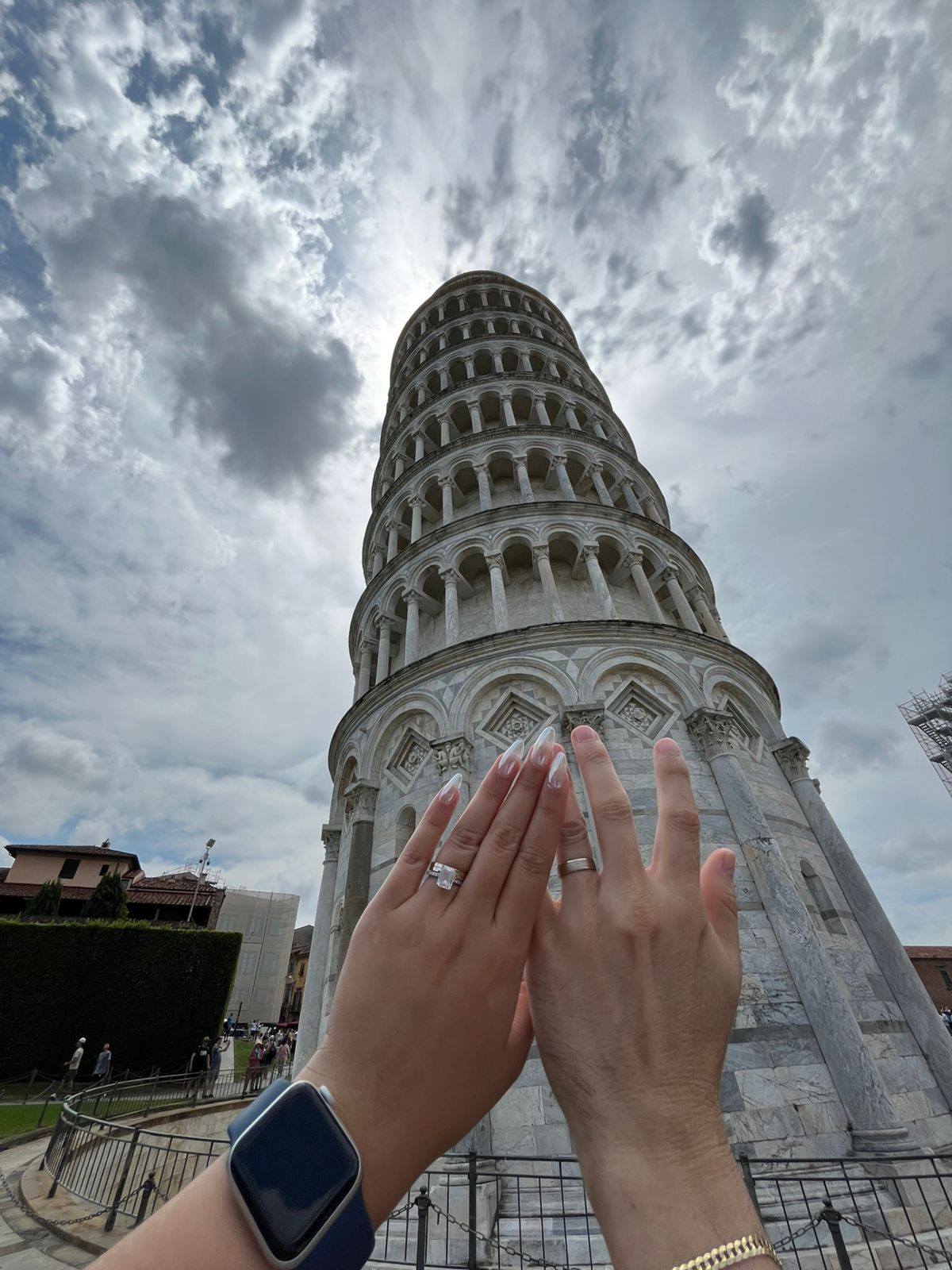 Nuestros clientes nos compartieron esta foto en la Torre Pisa luciendo sus anillos de boda.