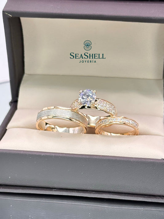 Trío de Anillos de Boda en Oros Combinados de 10k (Blanco y amarillo)