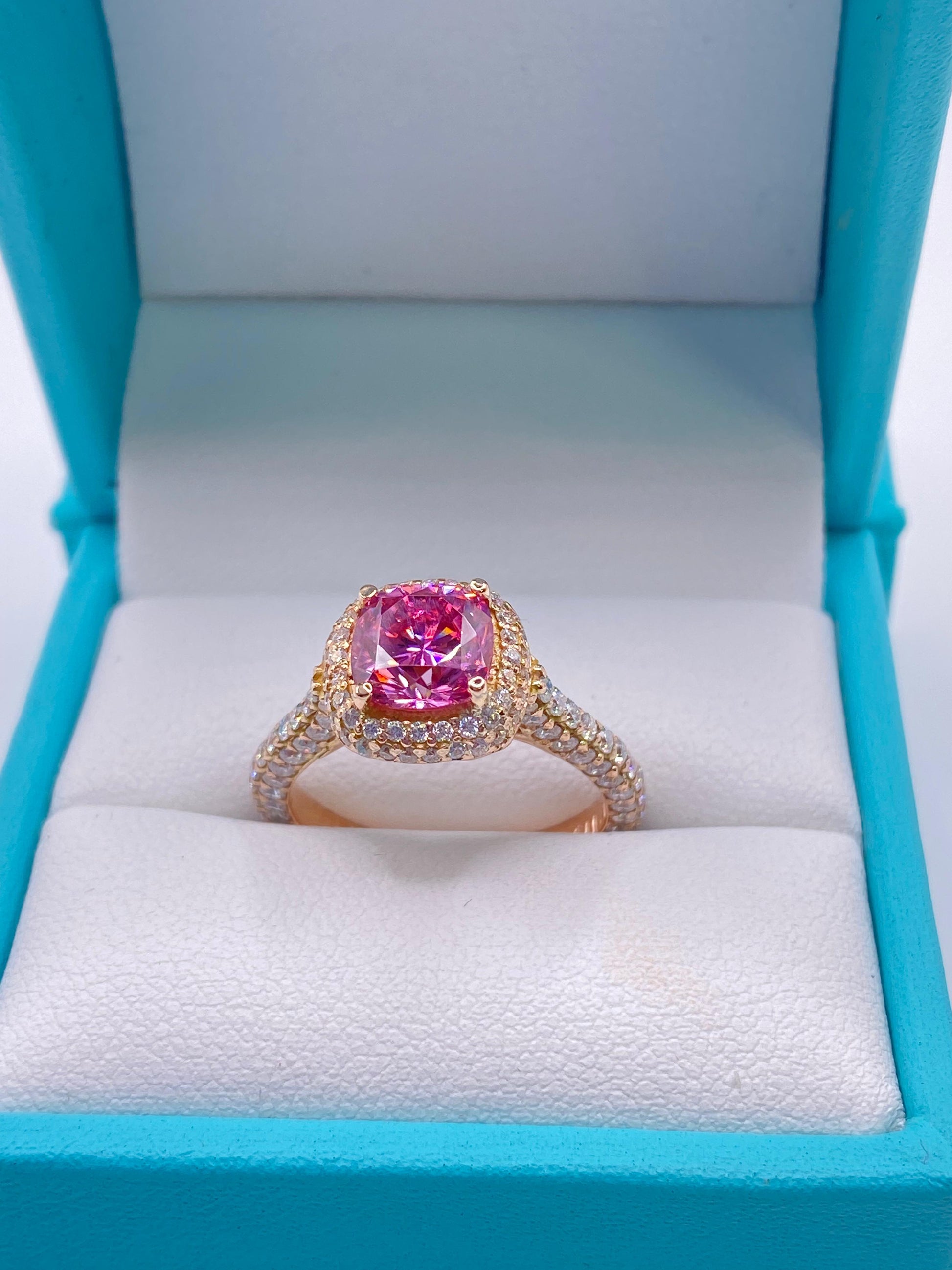 Su protagonista es una zirconia de corte cojín (cushion cut), que combina esquinas redondeadas con un brillo excepcional, realzada por un doble halo de pequeñas zirconias que la rodean, aportando profundidad y un resplandor adicional.