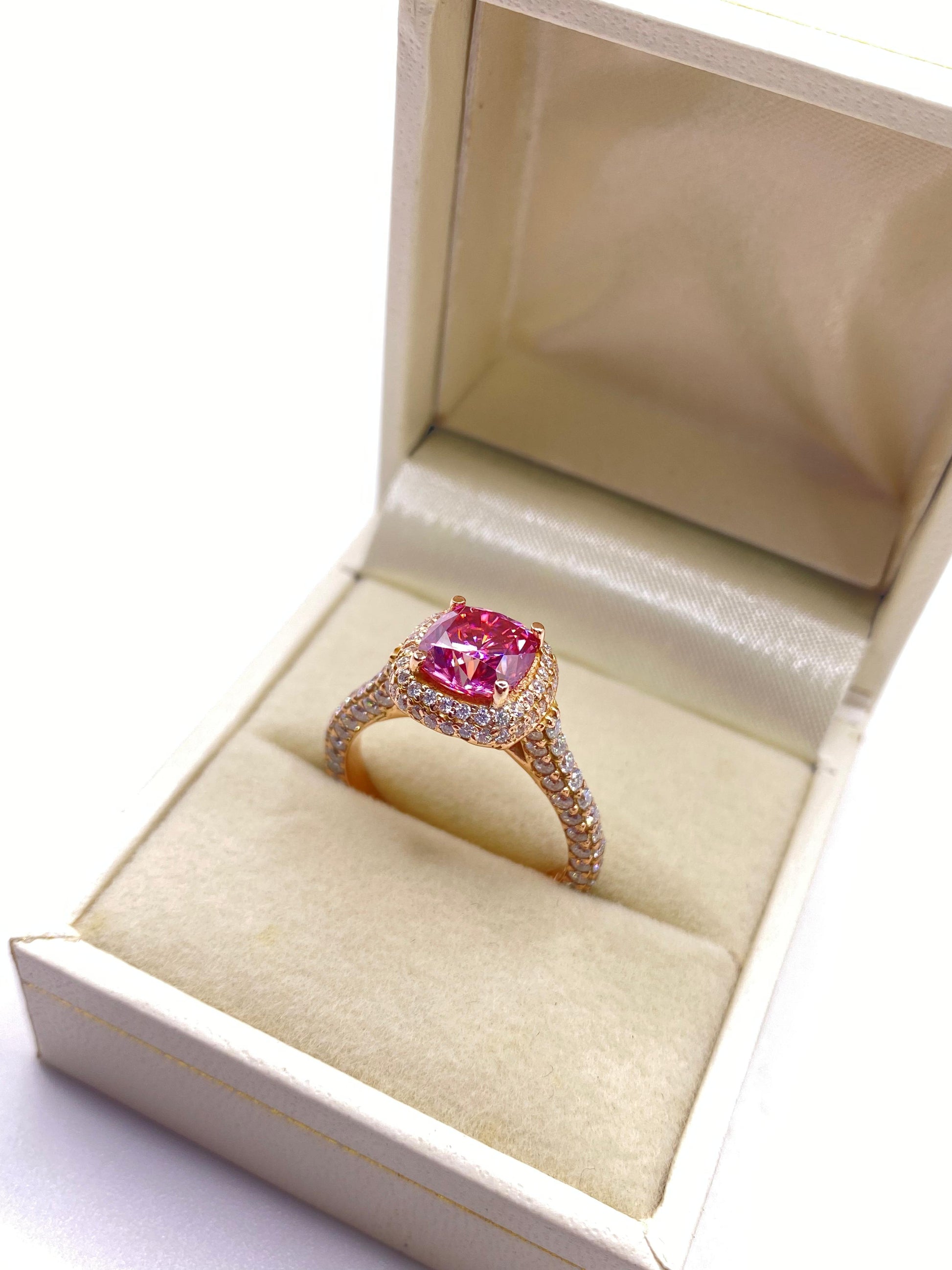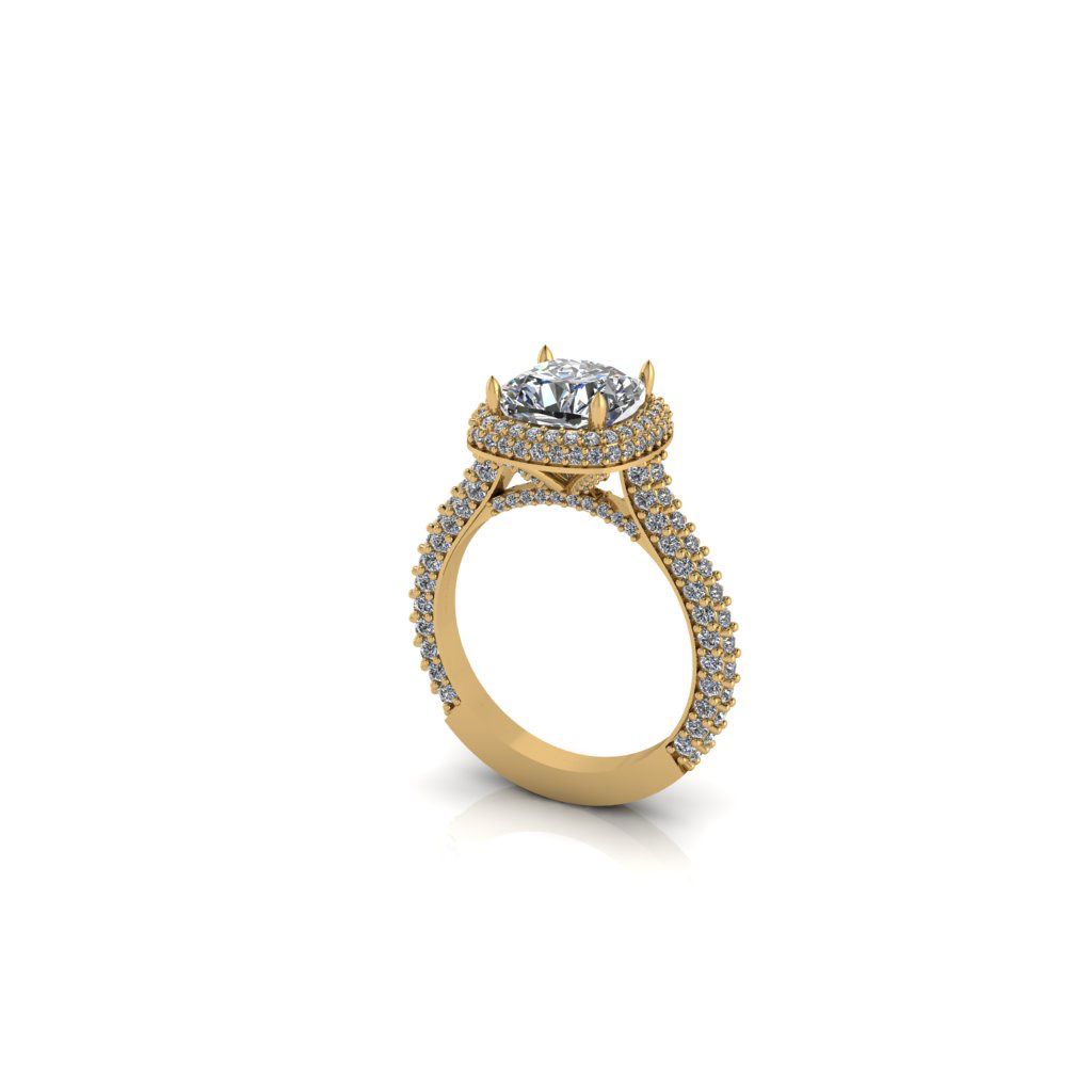 El brazo del anillo está completamente pavimentado con múltiples hileras de diamantes, extendiéndose incluso por los costados del engaste, lo que maximiza su brillo desde todos los ángulos. El diseño tridimensional de la montura le da una apariencia majestuosa y glamorosa, ideal para quienes buscan una pieza que combine elegancia clásica con un toque moderno y sofisticado.