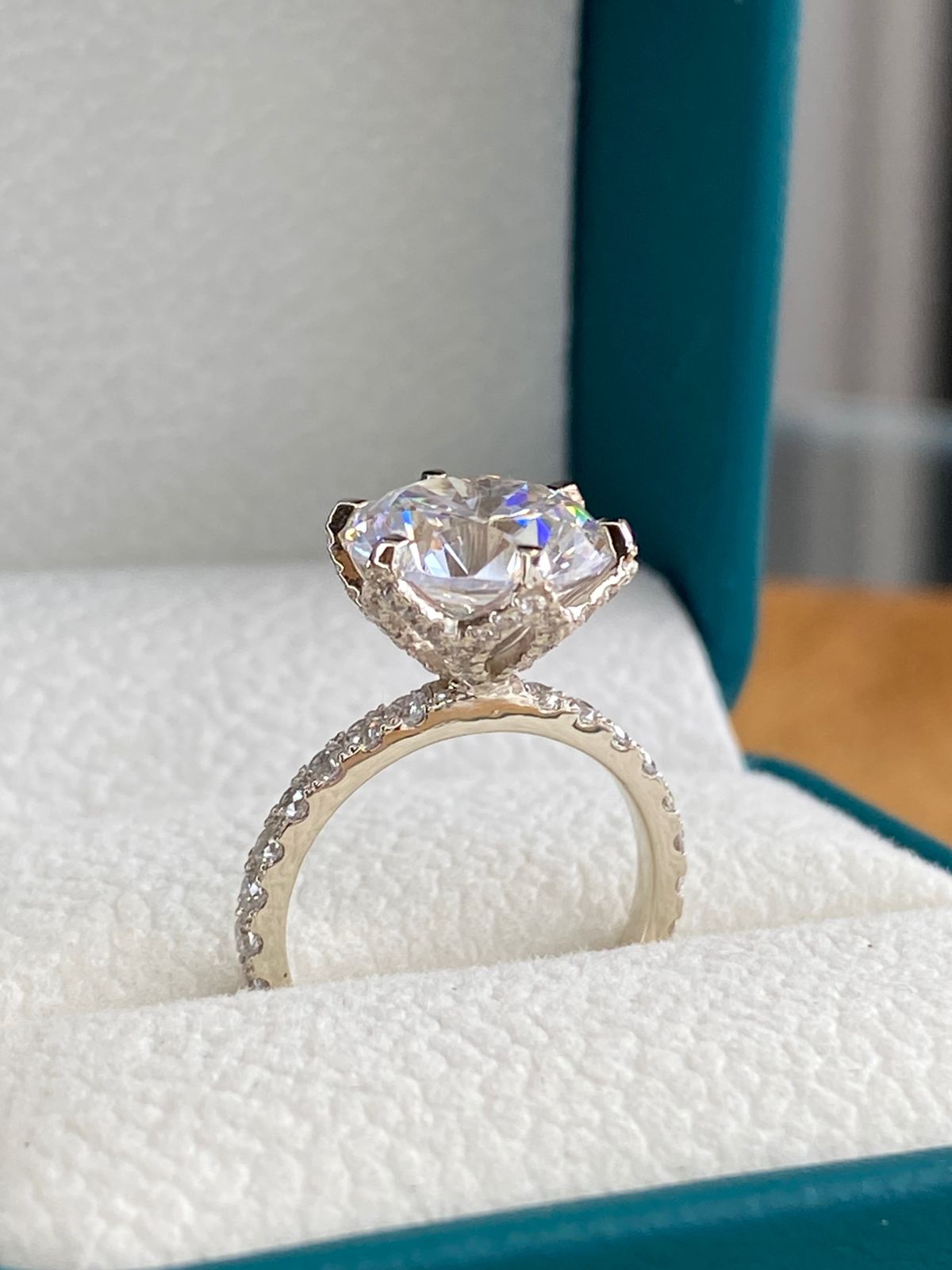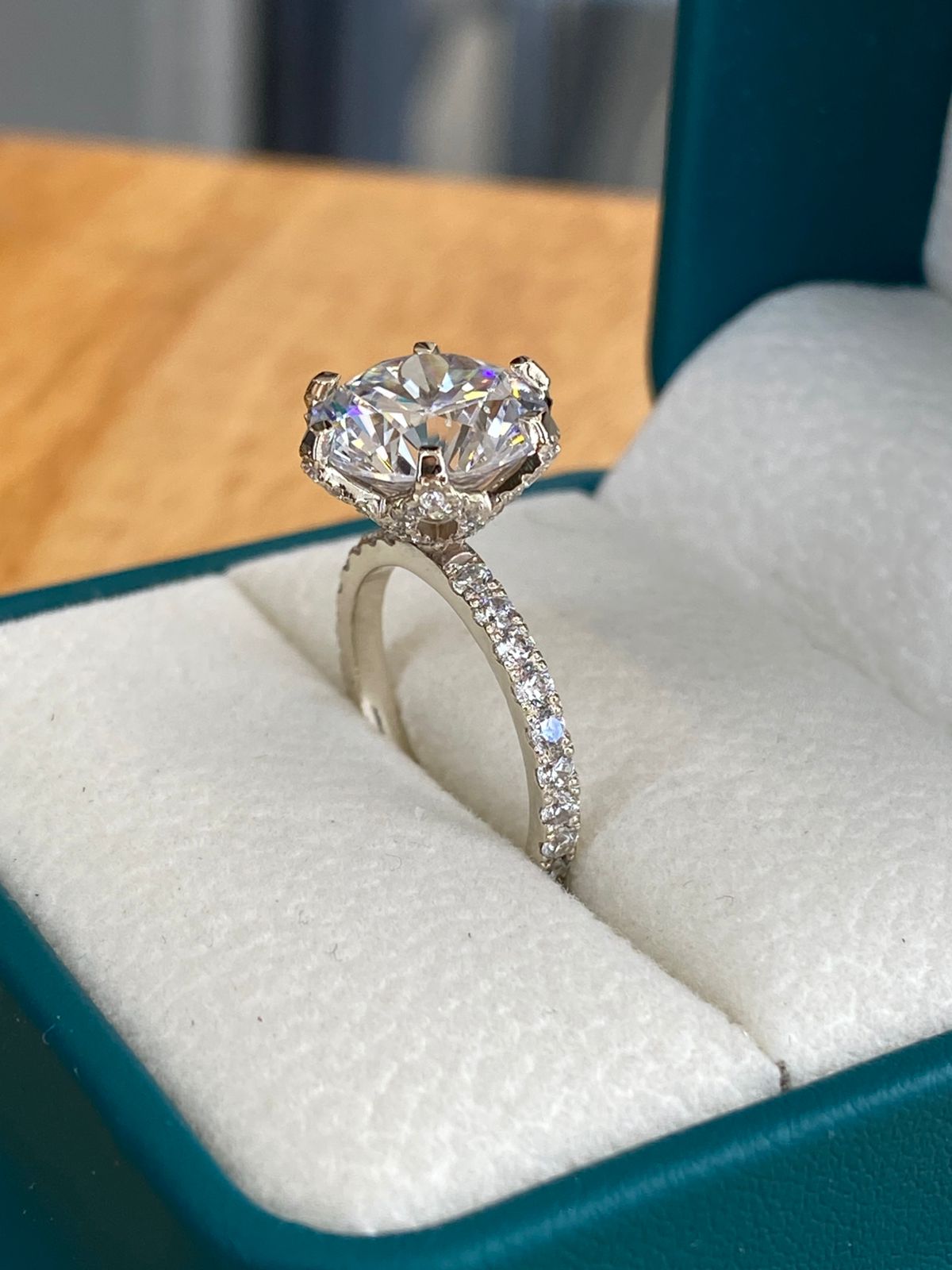 El brazo del anillo está finamente adornado con zirconias en pavé, que cubren casi toda la circunferencia visible, añadiendo un brillo continuo y refinado. Uno de los detalles más distintivos es el delicado trabajo artesanal debajo del engaste central, donde se puede apreciar una estructura calada con incrustaciones brillantes que aporta una vista lateral majestuosa y única.