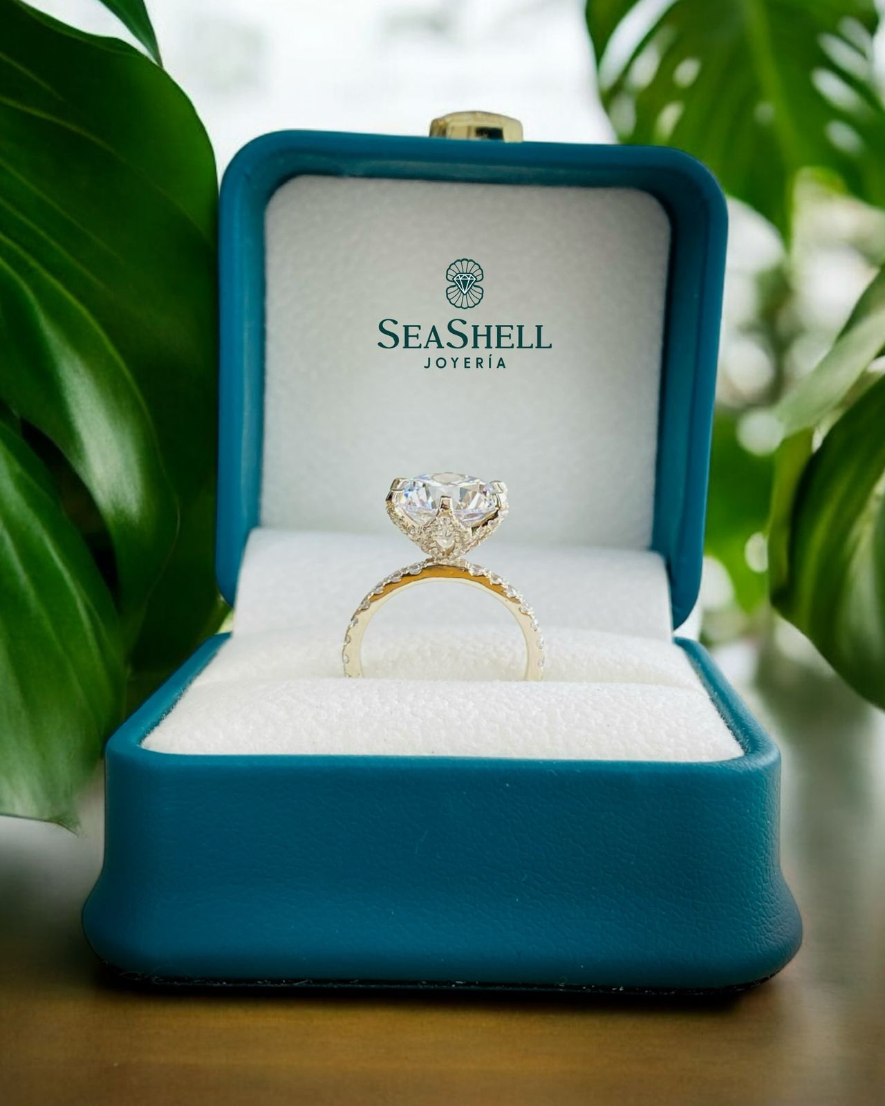 Elaborado en oro amarillo de 10 kilates , su protagonista es una brillante piedra central de gran tamaño en corte redondo, montada con seis garras que realzan su altura y permiten una máxima entrada de luz, haciendo que la gema destelle intensamente.