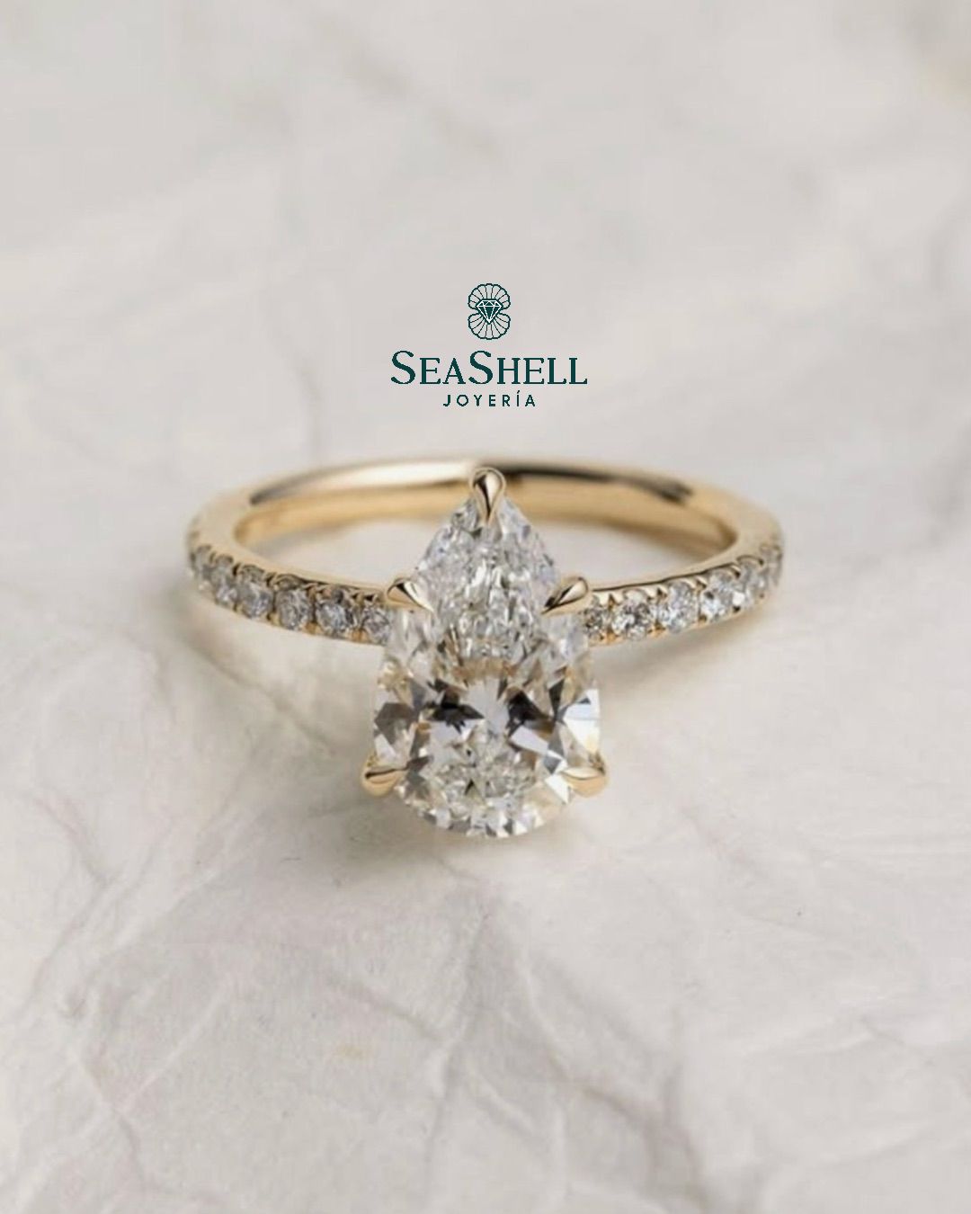 Su diseño destaca por una piedra central en corte pera (o lágrima), una forma que combina la elegancia del corte redondo con el carácter del corte marquesa, ideal para simbolizar amor y singularidad.